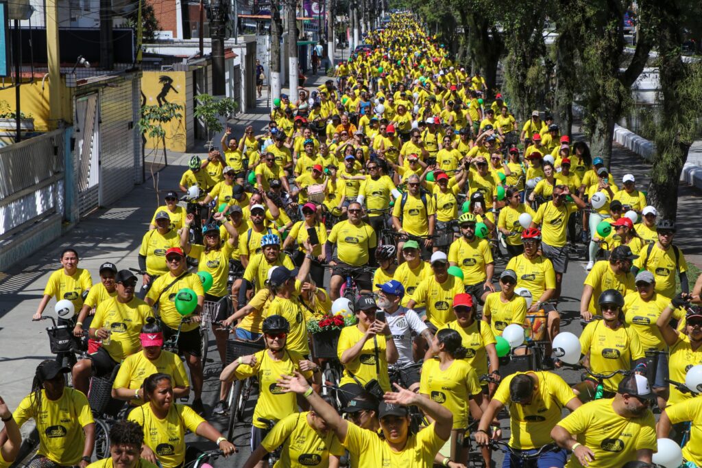 O Passeio Ciclístico ‘Bora Pedalar’, realizado na manhã deste sábado (27), em Santos, foi uma grande festa, reunindo famílias e amantes do ciclismo, cerca de 3.500 pessoas cruzaram as ruas da cidade. A saída foi do Novo Quebrar, com a chegada na Praça Mauá, na frente Prefeitura, com sua escadaria repleta de flores, fazendo parte das comemorações da Primavera Criativa. Os 1.500 inscritos pelo site, receberam o kit com mochila, camiseta, medalha e sacola. Na chegada, concorreram a prêmios, sendo o de maior destaque, uma bicicleta com 21 marchas.